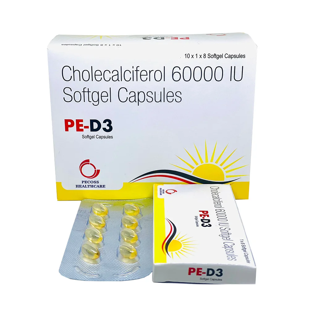 PE-D3 Vitamin D3 60000 IU Softgel contains Cholecalciferol 60000 IU that helps improve calcium absorption, strengthen bones, boost immunity, and support overall health in Vitamin D deficiency.